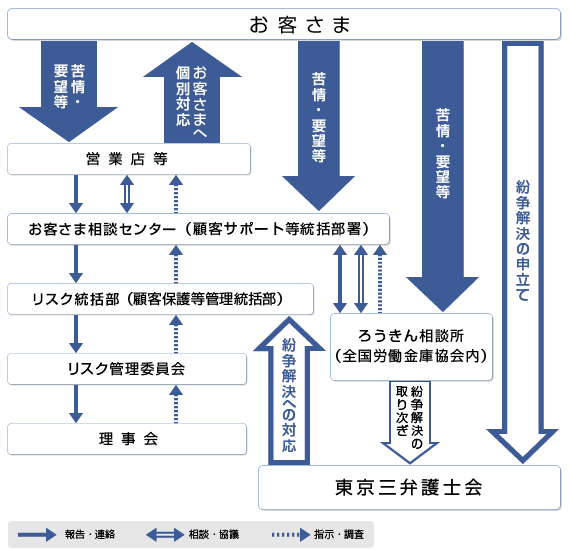 - 当金庫は、営業店等に苦情・要望対応要員および苦情・要望対応管理者を配置し、また、本部に設置したお客さま相談センターに顧客サポート等専任担当者を配置するとともに、リスク統括部を顧客保護等管理統括部署として、お客さまからいただいた「苦情・要望等」への対応・報告態勢を整えています。