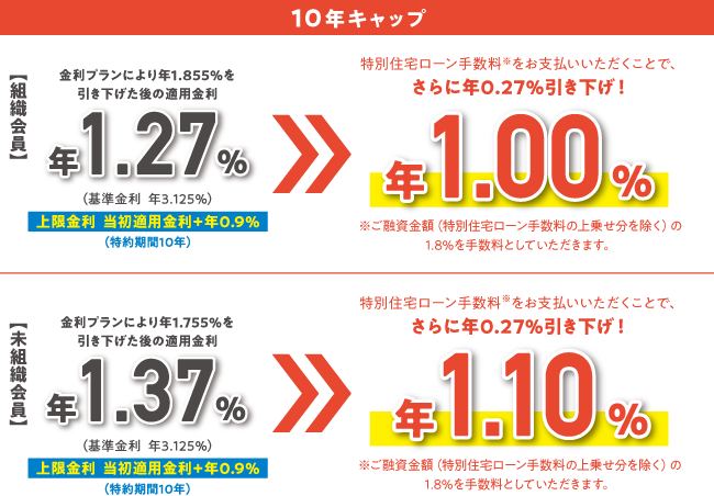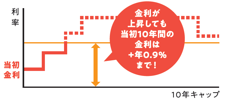 市場金利に連動する変動金利型住宅ローンです。当初お借り入れから10年間の特約期間中は、あらかじめ設定されている上限金利を超えることはありません。