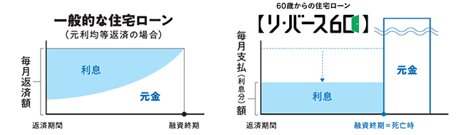 毎月のお支払は利息のみで、元金は、お客さまが亡くなられたときに、相続人の方から一括してご返済いただくか、担保物件(住宅および土地)の売却によりご返済いただくため、一般的な住宅ローンよりも毎月の支払の負担が少なく、例えば、年金収入の方にもご利用いただけます。
