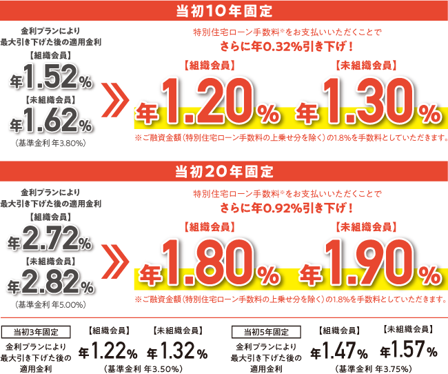 特約期間は3年、5年、10年、20年の4種類で、特約期間終了後は変動金利型となりますが、特約期間を再設定することもできます。